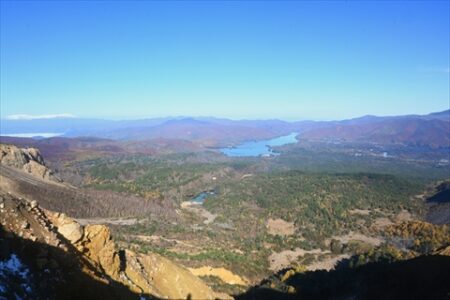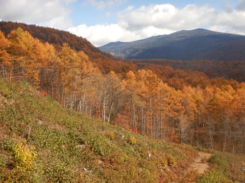 さらに進むと、伐採地に着き展望が開けます。カラマツの紅葉が見事でした。