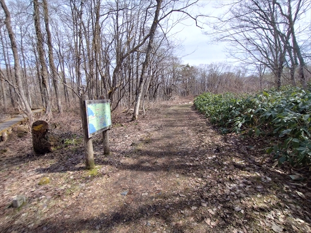 木道を進んでいくと、桧原湖畔探勝路へ向かう道との分岐につきます。