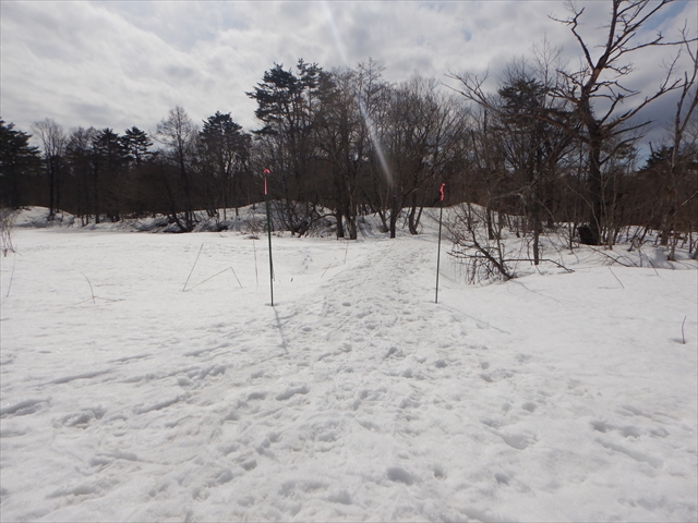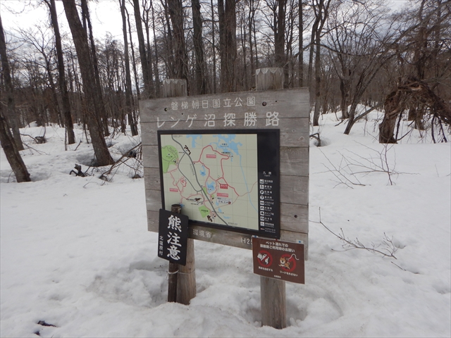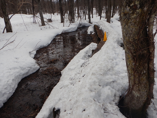 小川の上にかかる木道の上は残雪が高く、通行に適していません(他の木道は通行可能でした)。