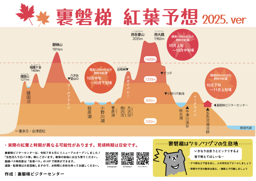 2025年10月3日 / 最終更新日時 : 2025年10月3日 VCstaff01 お知らせ 紅葉の見頃は? いよいよ10月になり、裏磐梯も紅葉シーズンに近づいてきました。例年の紅葉の見頃時期を標高をもとに予想!お出かけの参考にしてみてください。 ✨📷最新の自然情報やイベント情報はX・Instagramでも発信中📷✨🍁🐻フォローお願いします🐻🍁 X→ @urabandai_vc リンクInstagram → urabandai_visitor_center リンク pdfはこちら
